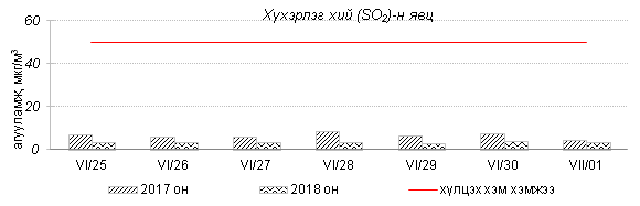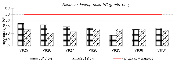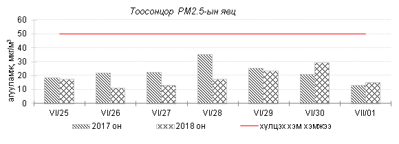 Өнгөрсөн 7 хоногийн агаарын чанарын хяналт шинжилгээний дүнгээр Улаанбаатар хотын төв автозамын дагуу Баруун 4 зам, 13-р хороолол орчим болон бүтээн байгуулалтын ажилтай холбоотойгоор 100 айл, Баянхошуу орчим PM10 тоосонцор, азотын давхар исэл “Бага зэргийн бохирдолтой” түвшинд хүрсэн байна. Хамгийн их бохирдолтой PM10 тоосонцрын 7 хоногийн дундаж агууламжийг өмнөх оны мөн үетэй харьцуулахад 8 хувиар бага түвшинд, харин 24 цагийн дундаж хамгийн их агууламж агаарын чанарын стандартаас 2.7 дахин их байлаа. Дэлгэрэнгүйг эндээс үзнэ үү.