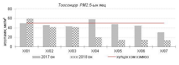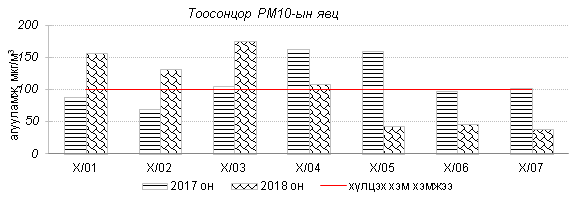 Өнгөрсөн 7 хоногийн агаарын чанарын хяналт шинжилгээний дүнгээр Улаанбаатар хотод 7 хоногийн эхний өдрүүдэд салхины эрчим ихэсч, хүйтэн байсантай холбоотойгоор агаарт тоосонцрын агууламж ихэсч агаарын чанар “Бага зэргийн бохирдол”-той түвшинд хүрсэн байна. Хамгийн их бохирдолтой PM10 тоосонцрын агууламжийг 2017 оны мөн үетэй харьцуулахад 11%-аар бага, 24 цагийн дундаж хамгийн их агууламж Агаарын чанарын стандартаас 3.8 дахин их байлаа. Дэлгэрэнгүйг эндээс үзнэ үү.