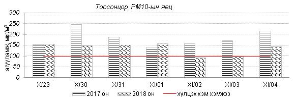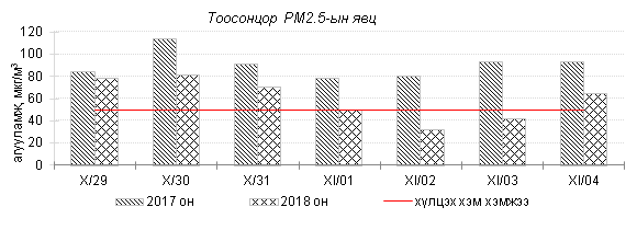Өнгөрсөн 7 хоногийн агаарын чанарын хяналт шинжилгээний дүнгээр Улаанбаатар хотын хэмжээнд агаарын чанар “Бага бохирдолтой” байсан байна. Хамгийн их бохирдол илэрсэн PM10 тоосонцрын агууламжийг 2017 оны мөн үетэй харьцуулахад 24%-иар бага, 24 цагийн дундаж хамгийн их агууламж Агаарын чанарын стандартаас 2.5 дахин их байлаа. Дэлэгрэнгүйг хавсралтаас үзнэ үү.