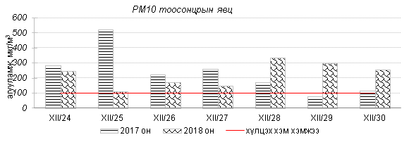 Өнгөрсөн 7 хоногийн агаарын чанарын хяналт шинжилгээний дүнгээр Улаанбаатар хотын гэр хороолол орчим бусад цэгээс хамгийн их бохирдол илэрч агаарын чанарын индексээр “Их бохирдолтой”, “Маш их бохирдолтой” түвшинд хүрсэн байна. Агаарт PM2.5, PM10 тоосонцрын агууламж хамгийн их байсан бөгөөд эдгээр тоосонцрын 24 цагийн дундаж хамгийн их агууламж Агаарын чанарын стандартаас 2-16 дахин их байлаа. Дэлгэрэнгүйг эндээс үзнэ үү.