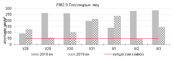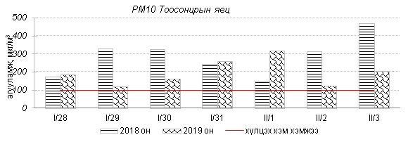 Улаанбаатар хотын агаарын чанарын хяналт шинжилгээний дүнгээр өнгөрсөн 7 хоногт агаарын чанарын индексээр “Их бохирдолтой” түвшинд хүрсэн байна. Агаарт PM2.5, PM10 тоосонцрын агууламж хамгийн их байсан бөгөөд эдгээр тоосонцрын 24 цагийн дундаж хамгийн их агууламж Агаарын чанарын стандартаас 4-7 дахин их байлаа. Дэлгэрэнгүйг эндээс үзнэ үү.