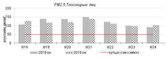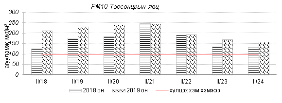 Өнгөрсөн 7 хоногийн агаарын чанарын хяналт шинжилгээний дүнгээр Толгойт, Зурагт, Баянхошуу, Амгалан, Цахилгаан станц орчим бусад цэгээс хамгийн их бохирдол илэрч агаарын чанарын индекс “Бохирдолтой” түвшинд хүрсэн байна. Агаарт PM2.5, PM10 тоосонцрын агууламж хамгийн их байсан бөгөөд эдгээр тоосонцрын 24 цагийн дундаж хамгийн их агууламж Агаарын чанарын стандартаас 3-4 дахин их байлаа. Дэлгэрэнгүйг эндээс үзнэ үү.