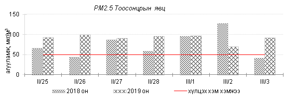 Өнгөрсөн 7 хоногийн агаарын чанарын хяналт шинжилгээний дүнгээр Зурагт, Баянхошуу орчим бусад цэгээс хамгийн их бохирдол илэрч агаарын чанарын индекс “Бохирдолтой” түвшинд хүрсэн байна. Агаарт PM2.5, PM10 тоосонцрын агууламж хамгийн их байсан бөгөөд эдгээр тоосонцрын 24 цагийн дундаж хамгийн их агууламж Агаарын чанарын стандартаас 3-3.5 дахин их байлаа. Дэлгэрэнгүйг эндээс үзнэ үү.