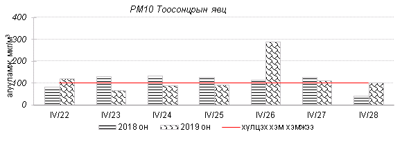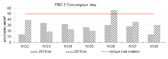 Өнгөрсөн 7 хоногийн агаарын чанарын хяналт шинжилгээний дүнгээр Улаанбаатар хотын хэмжээнд 26-ны өдрөөс бусад өдрүүдэд агаар “Хэвийн” болон “Бага бохирдолтой” түвшинд байлаа. Харин 26-ны өдөр хүчтэй шороон шуурганы улмаас Баянхошуу, Цахилгаан станц орчимд “Маш их бохирдолтой”, “Их бохирдолтой” түвшинд хүрч PM10 тоосонцрын агууламж эрс ихэссэн байна. 28-ны өдөр бороо орохын өмнө богино хугацаанд хүчтэй салхилсан хэдий ч 24 цагийн дундажаар агаар “Бага бохирдолтой” түвшинд байсан байна. PM10 тоосонцрын 24 цагийн дундаж хамгийн их агууламж Агаарын чанарын стандартаас 5.4 дахин их байсан байна. Дэлгэрэнгүйг эндээс үзнэ үү.