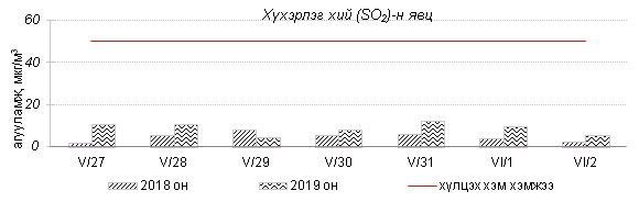 Улаанбаатар хотын агаарт түгээмэл бохирдуулах бодис хүхэрлэг хий /SO2/, азотын давхар исэл /NO2/, тоосонцор /PM10, PM2.5/, нүүрстөрөгчийн дутуу исэл /CO/, озон /O3/-ны агууламжийг тодорхойллоо.