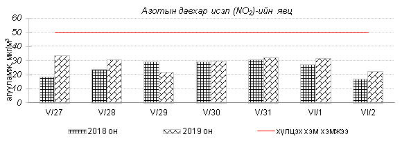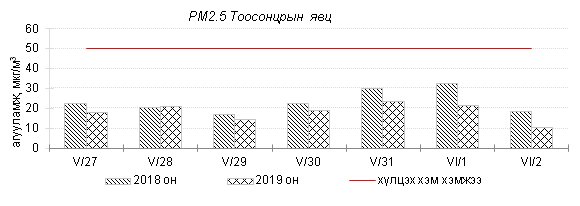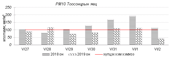 Өнгөрсөн 7 хоногийн агаарын чанарын хяналт шинжилгээний дүнгээр Улаанбаатар хотын төв автозам дагуу буюу Баруун 4 зам, 13-р хороолол, Нисэх, Баянхошуу орчмын гэр хороолол, Цахилгаан станц орчим “Бага бохирдолтой” түвшинд хүрсэн байна. Агаар бохирдуулах бодисуудаас PM10 тоосонцрын агууламж их илэрсэн бөгөөд 24 цагийн дундаж хамгийн их агууламж Нисэх орчим Агаарын чанарын стандартаас 2.6 дахин их байна. Дэлгэрэнгүйг эндээс үзнэ үү.