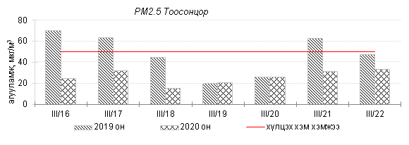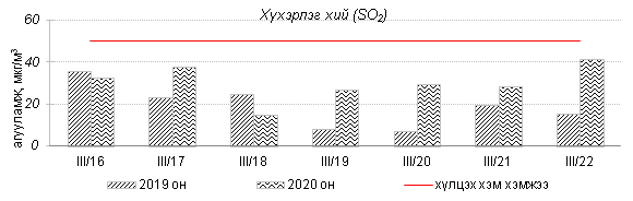Улаанбаатар хотын агаарт түгээмэл бохирдуулах бодис хүхэрлэг хий /SO2/, азотын давхар исэл /NO2/, тоосонцор /PM10, PM2.5/, нүүрстөрөгчийн дутуу исэл /CO/, озон /O3/-ны агууламжийг тодорхойллоо.
