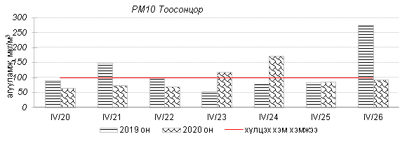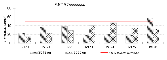 Улаанбаатар хотын агаарт түгээмэл бохирдуулах бодис хүхэрлэг хий /SO2/, азотын давхар исэл /NO2/, тоосонцор /PM10, PM2.5/, нүүрстөрөгчийн дутуу исэл /CO/, озон /O3/-ны агууламжийг тодорхойллоо.