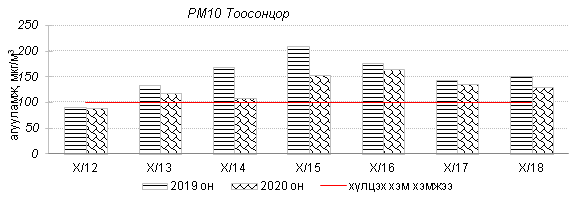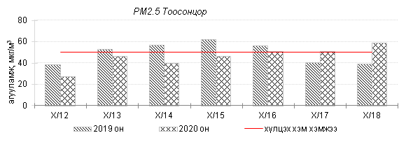 Улаанбаатар хотын агаарт түгээмэл бохирдуулах бодис хүхэрлэг хий /SO2/, азотын давхар исэл /NO2/, тоосонцор /PM10, PM2.5/, нүүрстөрөгчийн дутуу исэл /CO/, озон /O3/-ны агууламжийг тодорхойллоо.