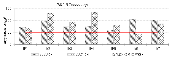 Улаанбаатар хотын агаарт түгээмэл бохирдуулах бодис хүхэрлэг хий /SO2/, азотын давхар исэл /NO2/, тоосонцор /PM10, PM2.5/, нүүрстөрөгчийн дутуу исэл /CO/, озон /O3/-ы агууламжийг тодорхойллоо.
