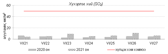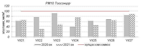Улаанбаатар хотын агаарт түгээмэл бохирдуулах бодис хүхэрлэг хий /SO2/, азотын давхар исэл /NO2/, тоосонцор /PM10, PM2.5/, нүүрстөрөгчийн дутуу исэл /CO/, озон /O3/-ы агууламжийг тодорхойллоо.