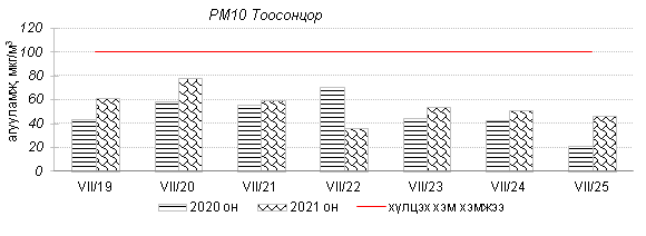 Өнгөрсөн 7 хоногийн агаарын чанарын хяналт шинжилгээний дүнгээр Улаанбаатар хотын агаарын чанар ихэнхдээ “Цэвэр” болон “Хэвийн” түвшинд байсан бөгөөд Амгалан, Баруун 4 зам, Нисэх орчимд бага бохирдолтой түвшинд хүрсэн байна. Дэлгэрэнгүйг доорх хавсралтаас үзнэ үү.
